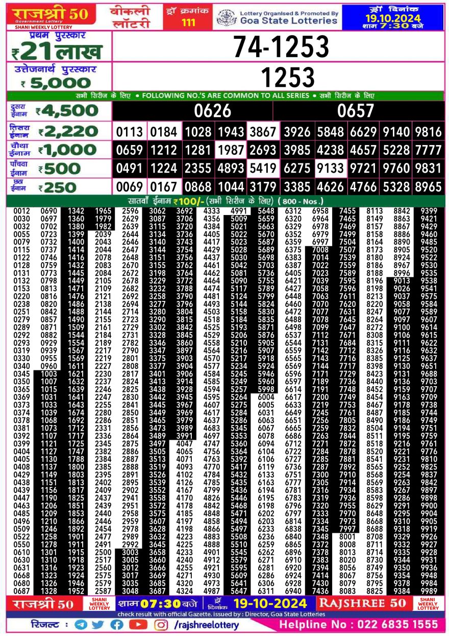 Rajshree 50  Lottery 7:30PM Result 19.10.24