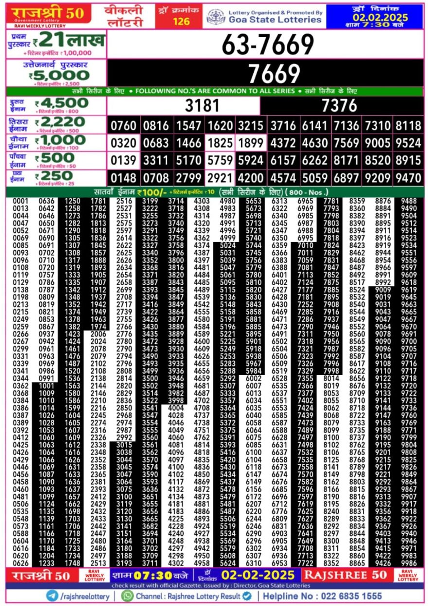 Rajshree 50 Lottery 7:30PM Result 2.2.2025