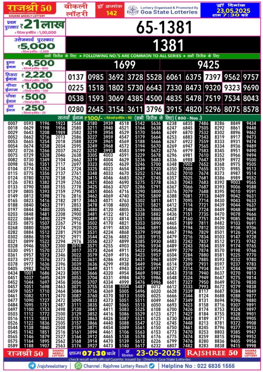 Rajshree 50 Lottery 7:30PM Result 23.05.2025