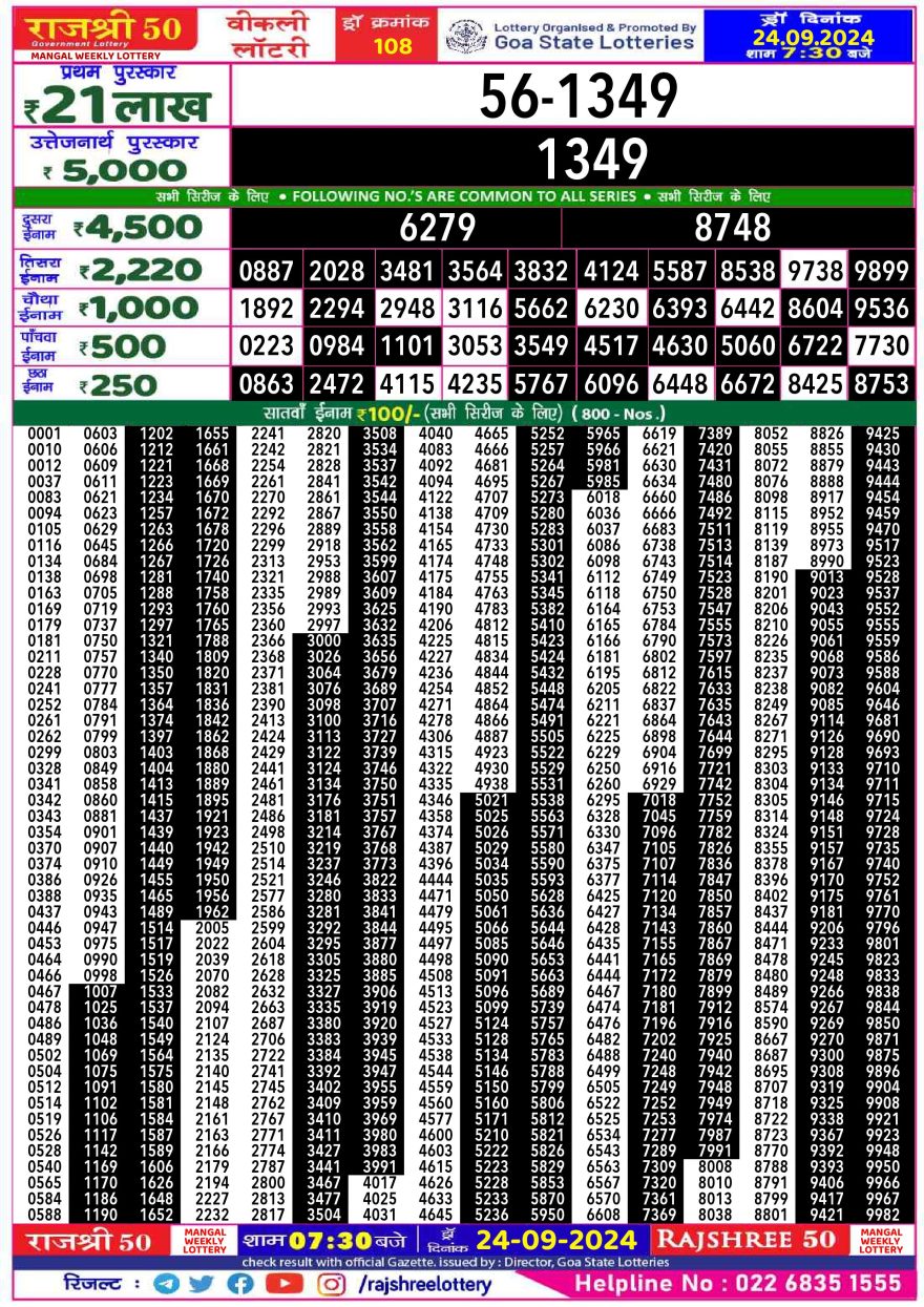 Rajshree 50  Lottery 7:30PM Result 24.09.24