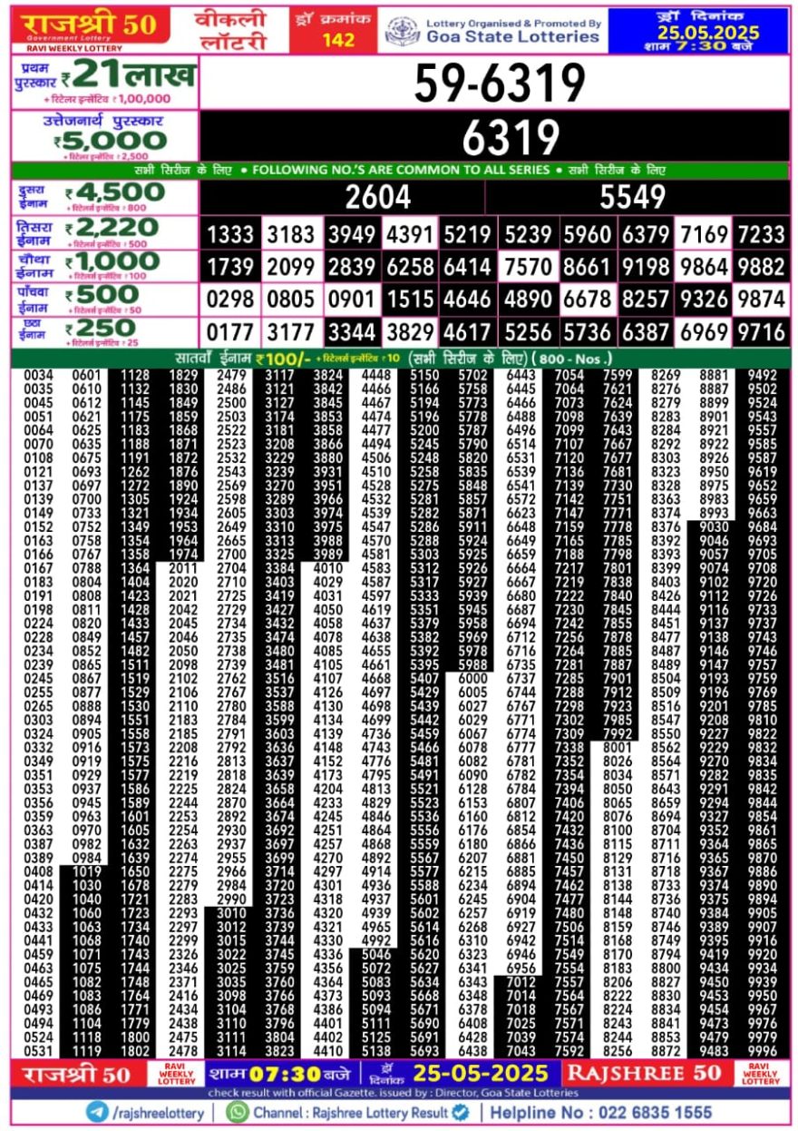 Rajshree 50 Lottery 7:30PM Result 25.05.2025