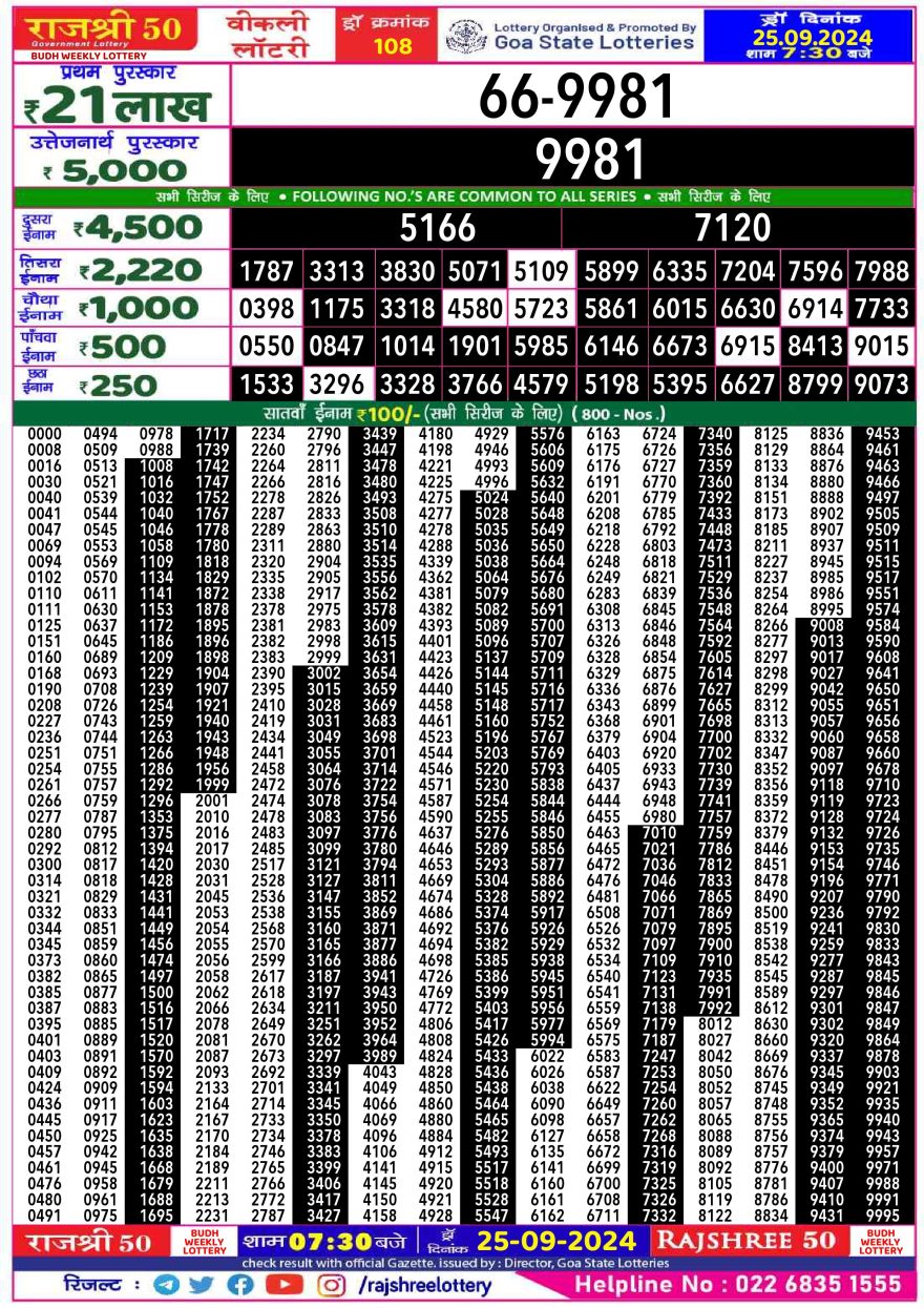 Rajshree 50  Lottery 7:30PM Result 25.09.24