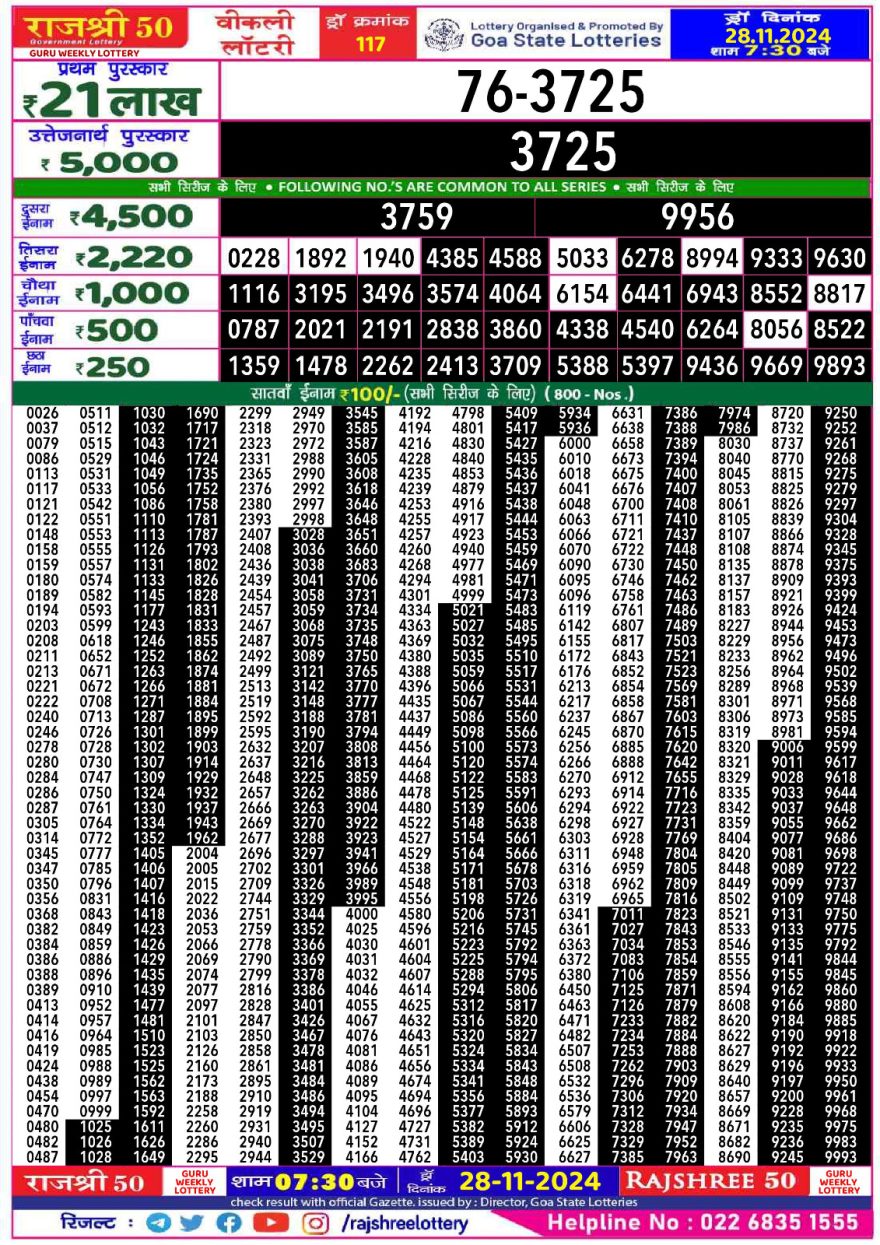 Rajshree 50  Lottery 7:30PM Result 28.11.24