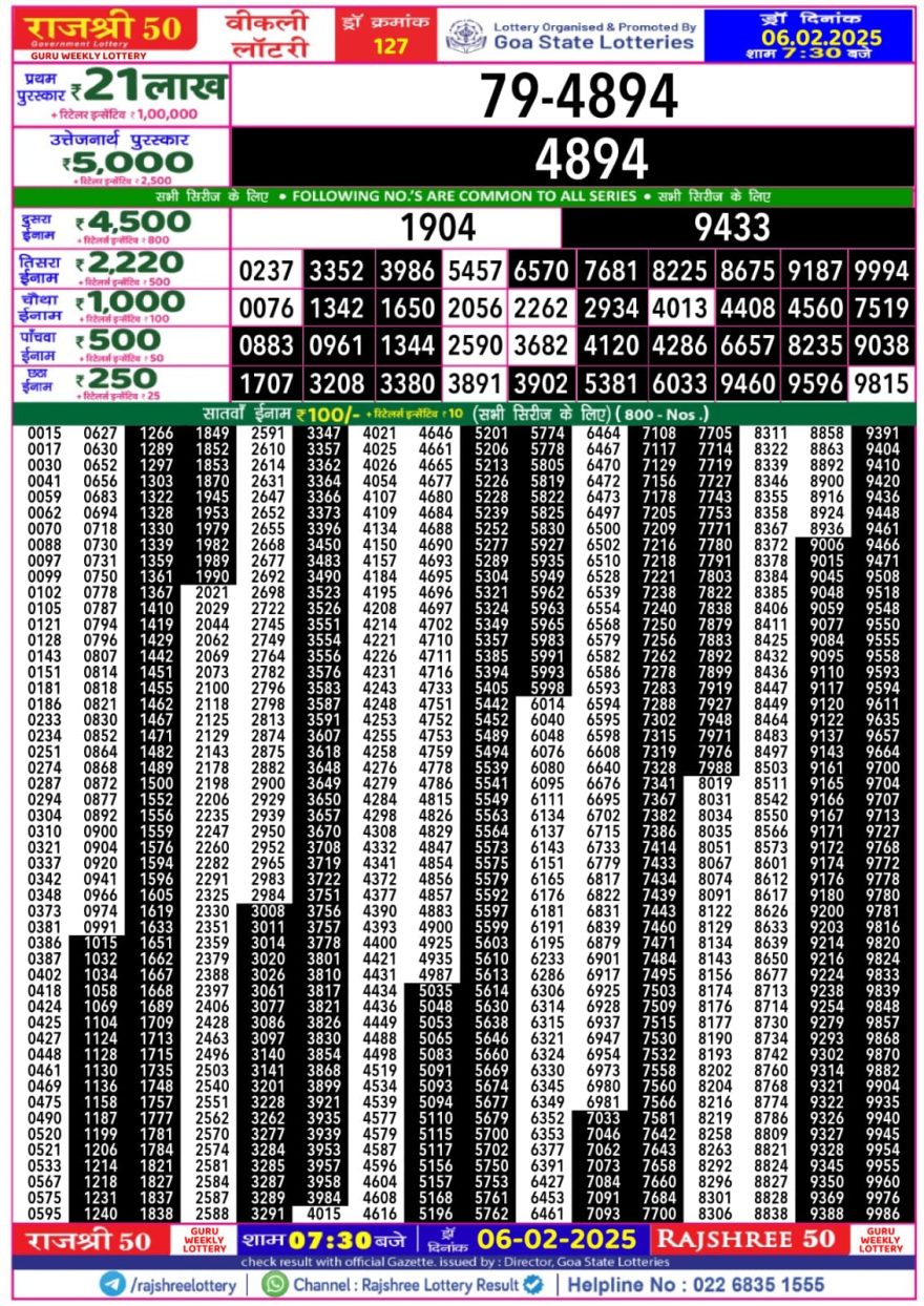 Rajshree 50 Lottery 7:30PM Result 6.2.25