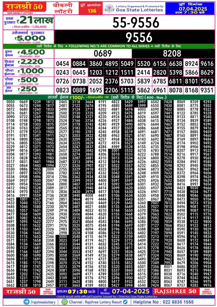 Rajshree 50 Lottery 7:30PM Result 7.4.25