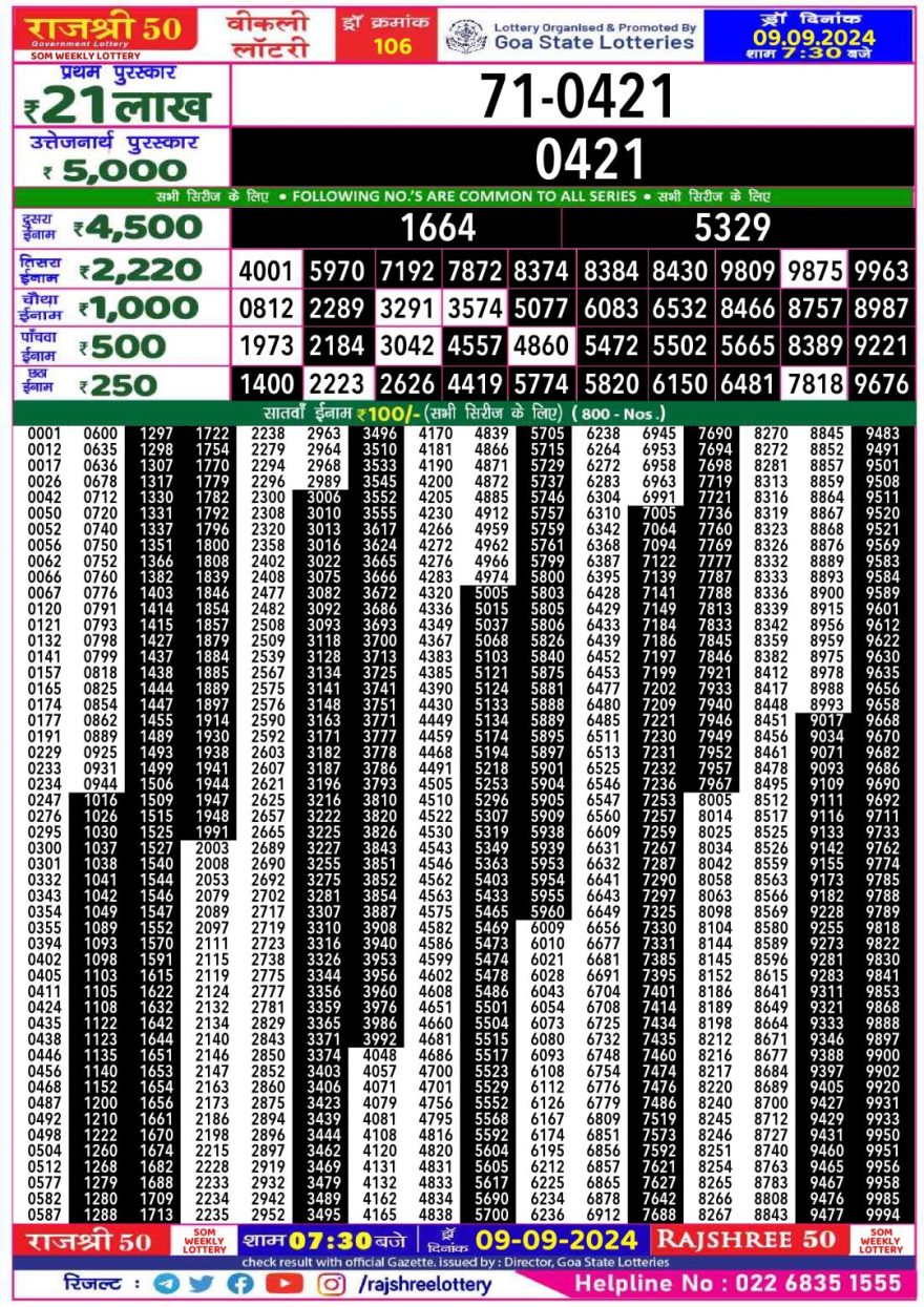 Rajshree 50  Lottery 7:30PM Result 9.09.24