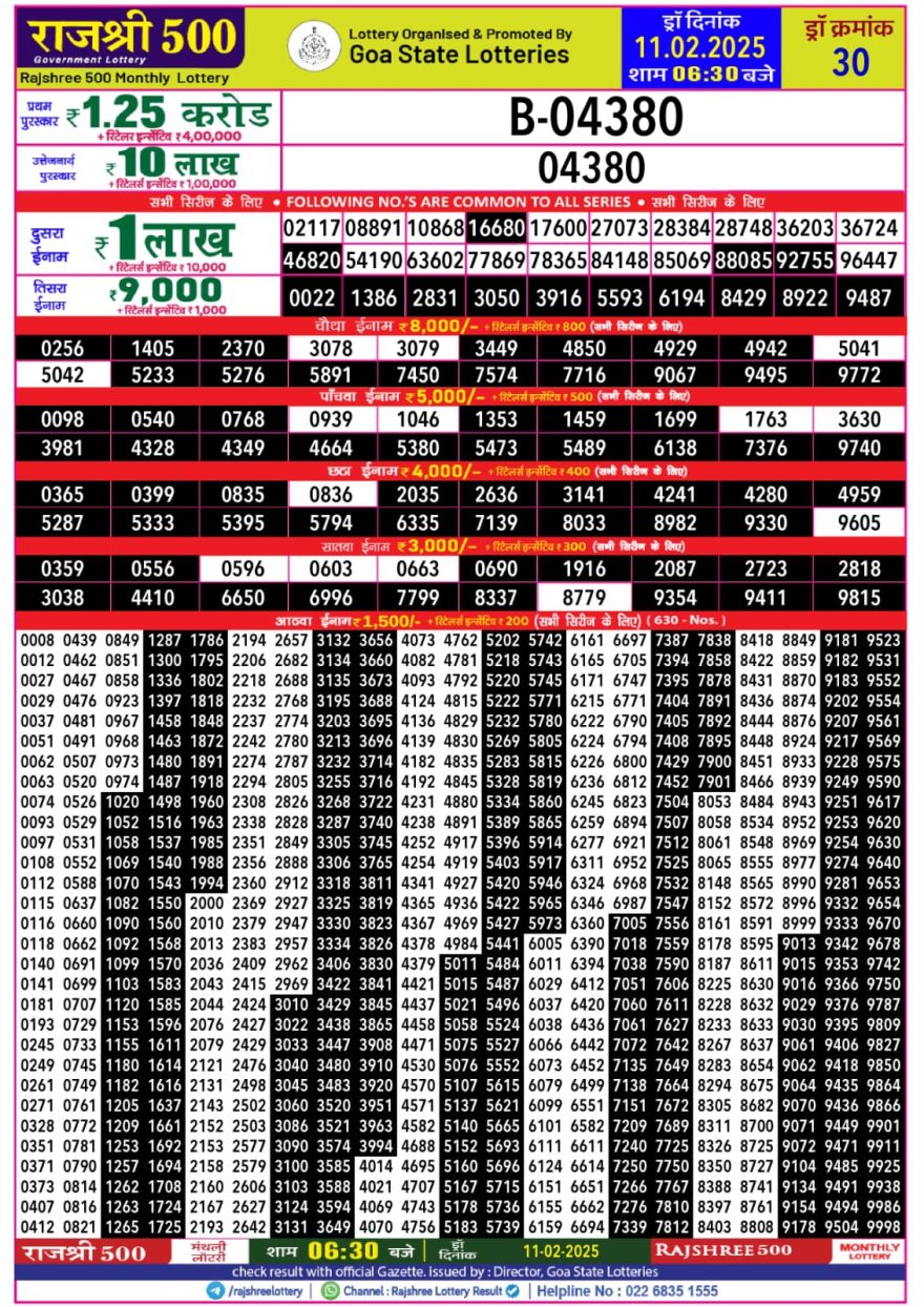 Rajshree 500 monthly Lottery 6.30PM Result 11.2.25