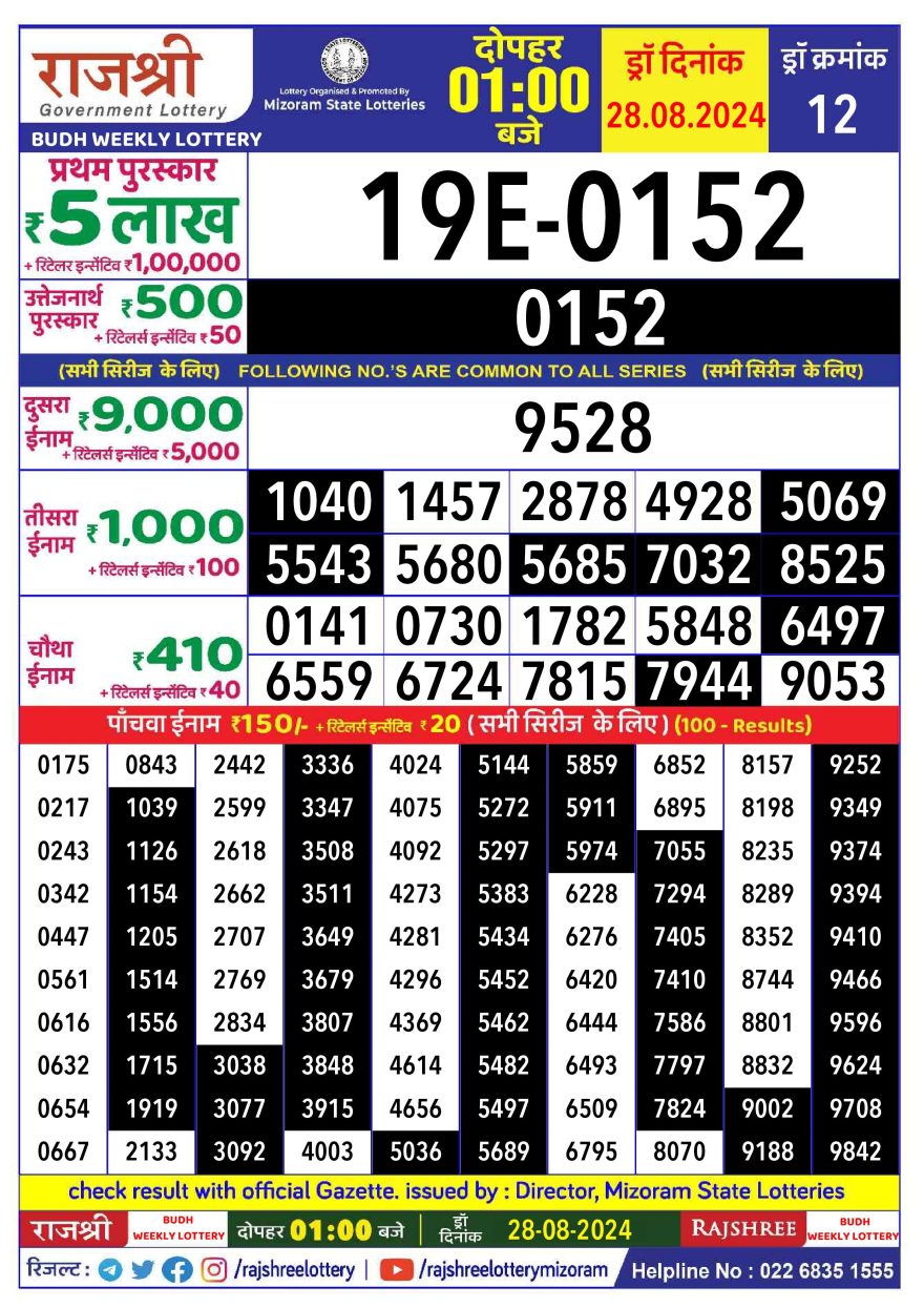 Rajshree budh wednesday Weekly Lottery 1PM Result 28.8.24