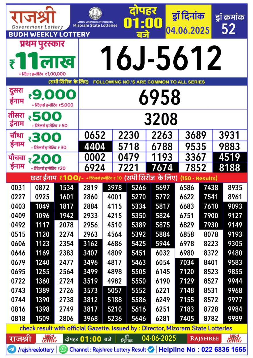 Rajshree Budh Weekly Lottery 1PM Result 04.06.2025