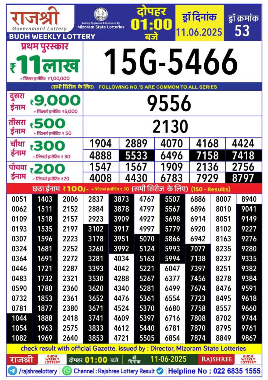 Rajshree Budh Weekly Lottery 1PM Result 11.06.2025