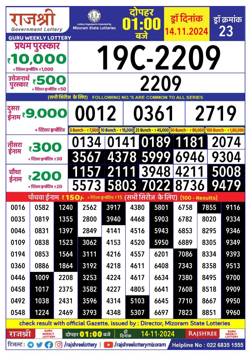 Rajshree guru monday Weekly Lottery 1PM Result 14.11.24