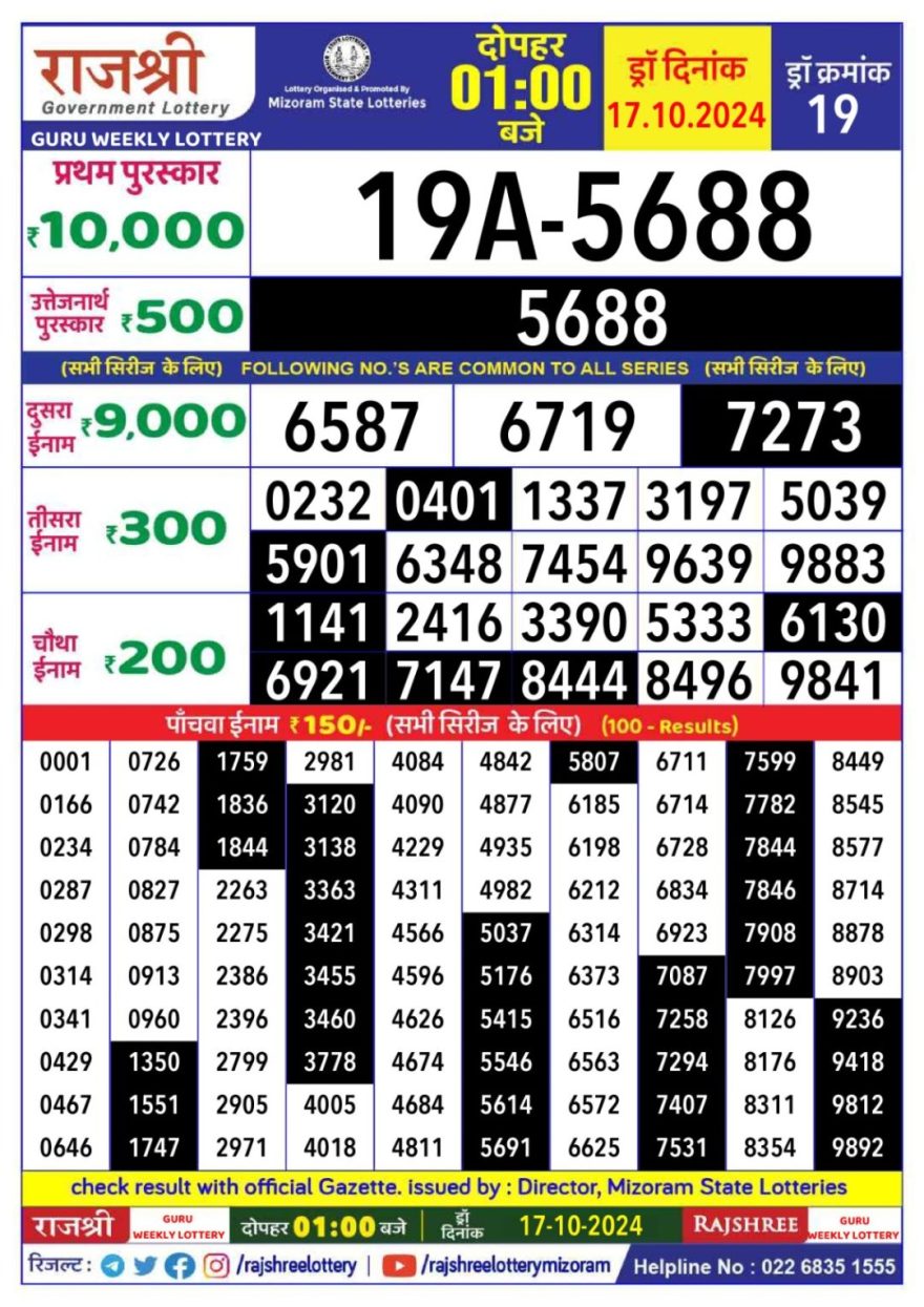 Rajshree guru thursday  Weekly Lottery 1PM Result 17.10.24