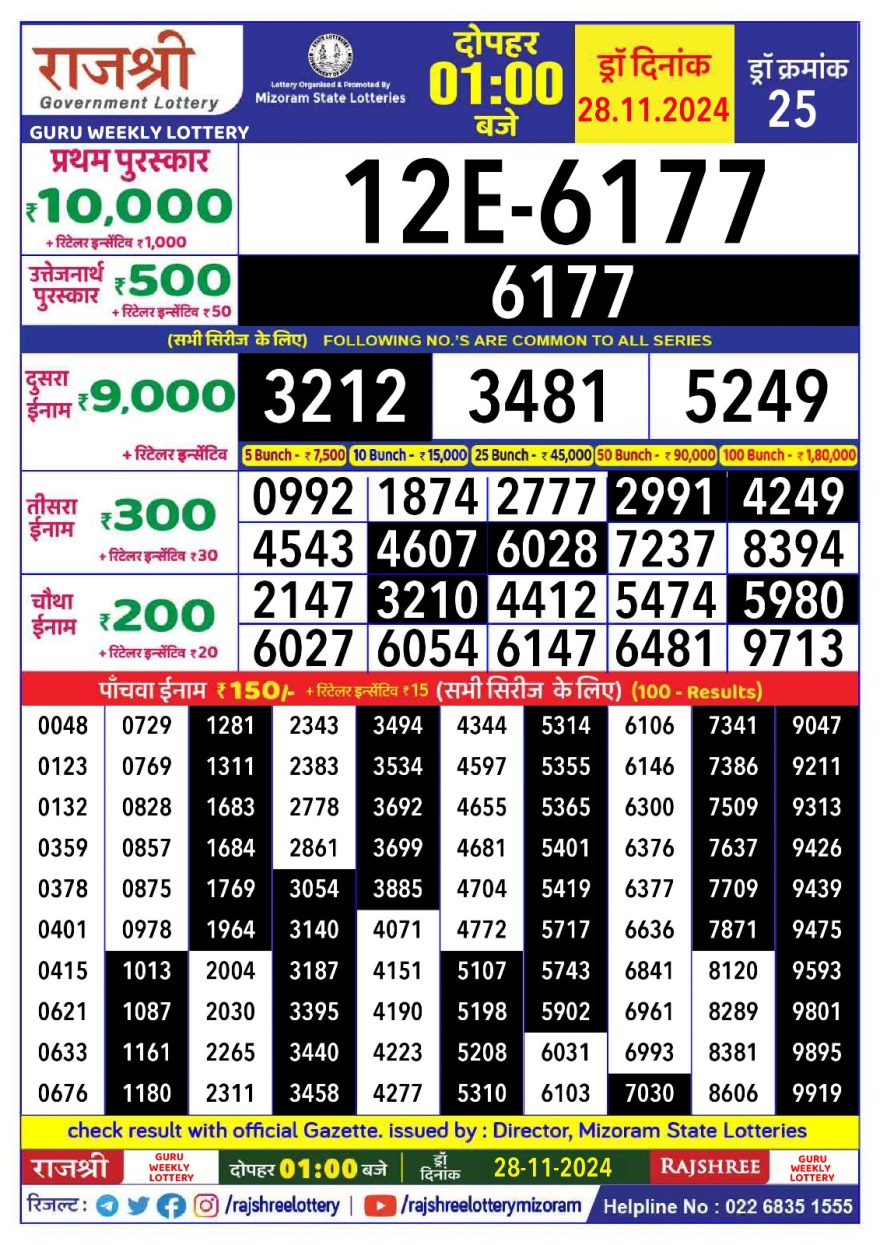 Rajshree guru Thursday Weekly Lottery 1PM Result 28.11.24
