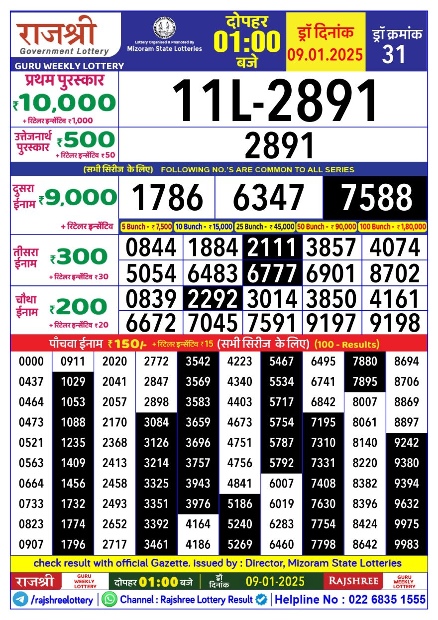 Rajshree Guru Thursday Weekly Lottery 1PM Result 9.1.25