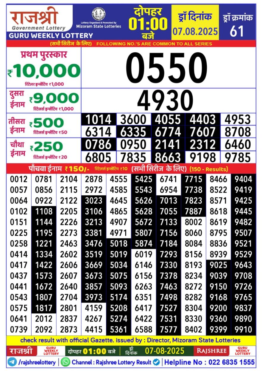 Rajshree Guru Weekly Lottery 1pm Result 07.08.2025