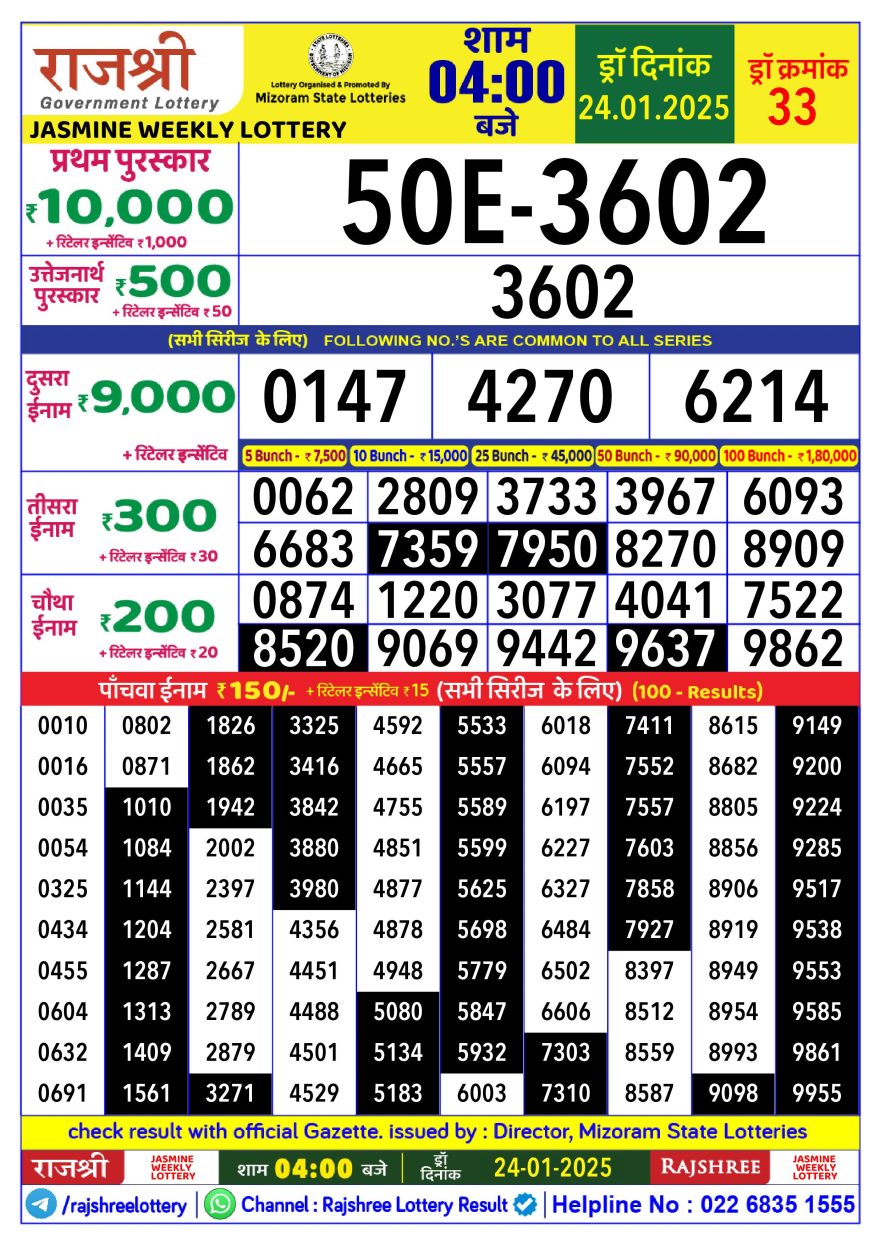 Rajshree jasmine Friday Weekly Lottery 4PM Result 24.1.25