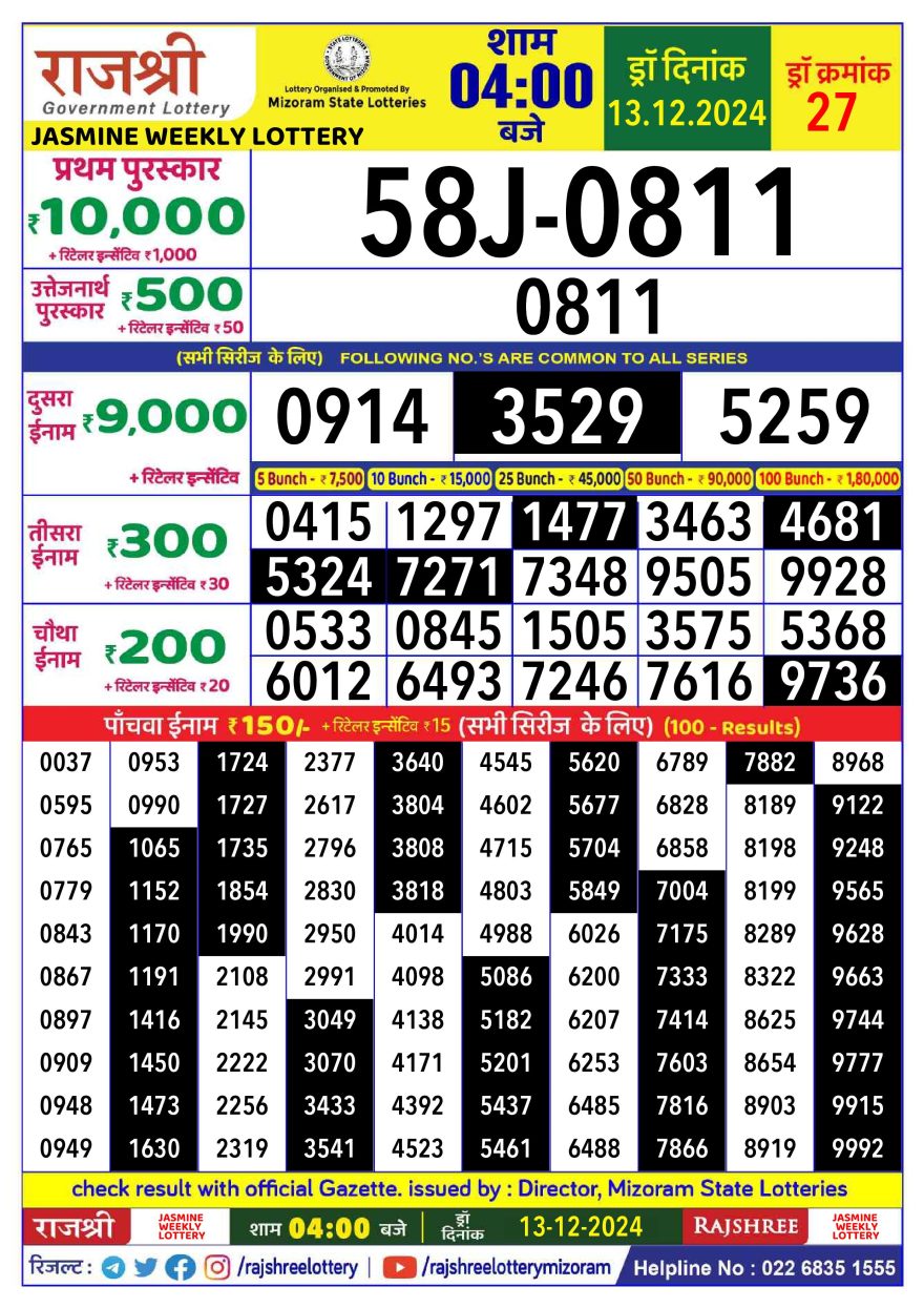 Rajshree jasmine tuesday Weekly Lottery 4PM Result 13.12.24
