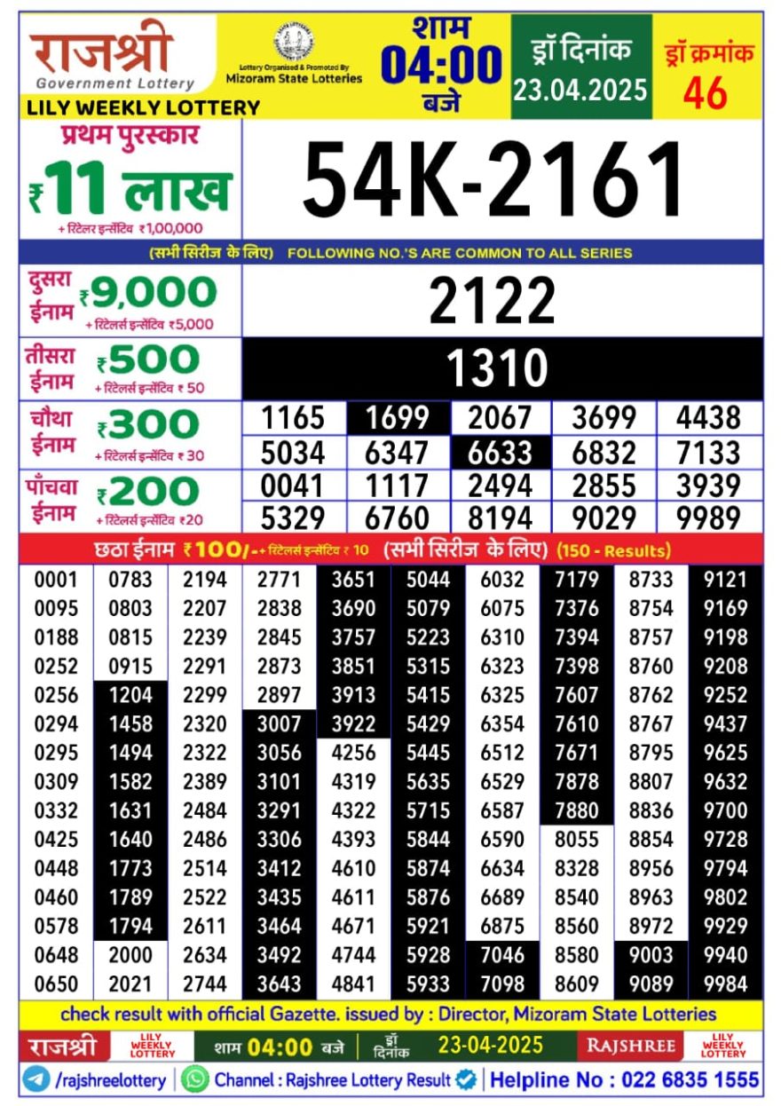 Rajshree Lily Wednesday Weekly Lottery 4PM Result 23.4.25