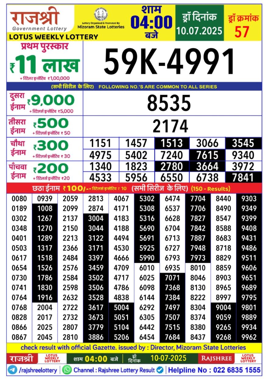 Rajshree Lotus Thursday Weekly Lottery 4PM Result 10.07.2025