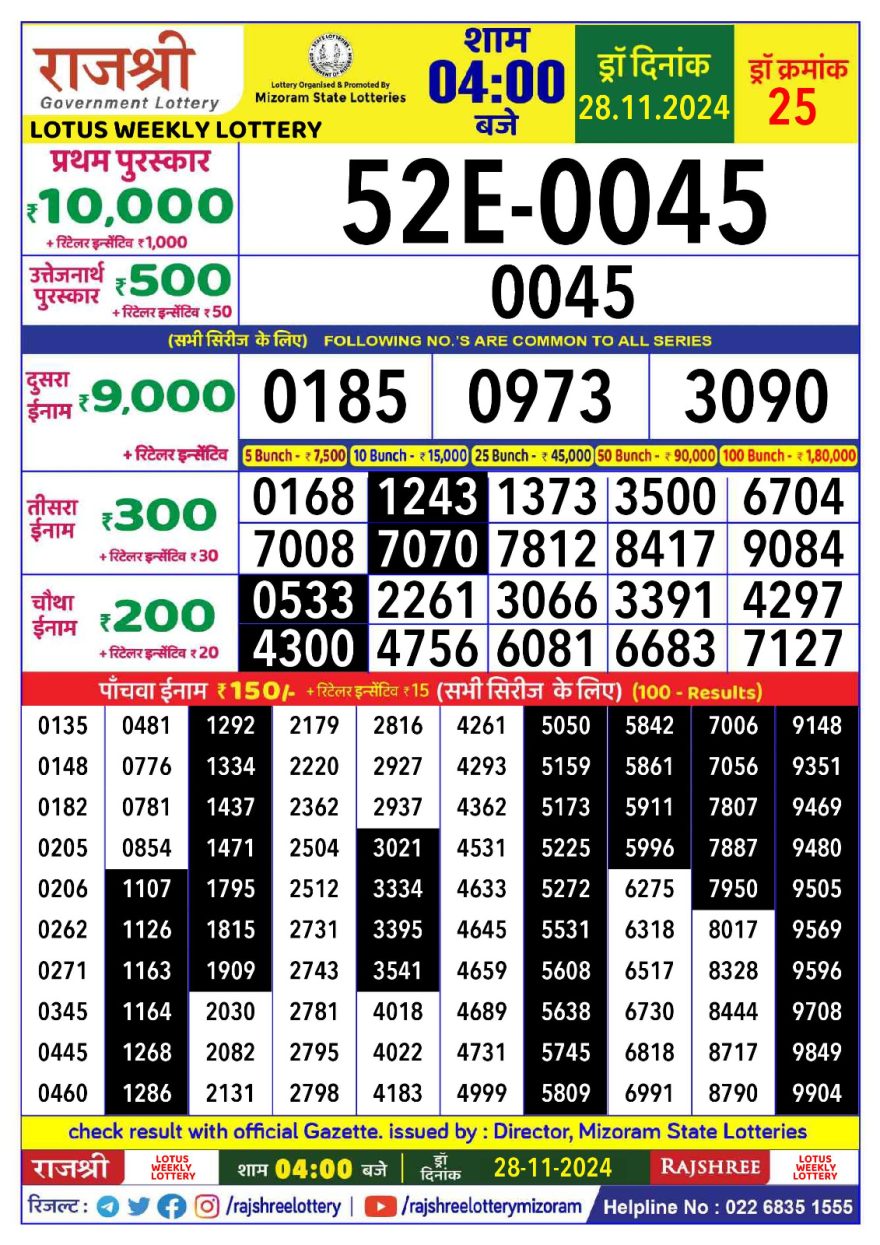 Rajshree lotus tuesday  Weekly Lottery 4PM Result 28.11.24