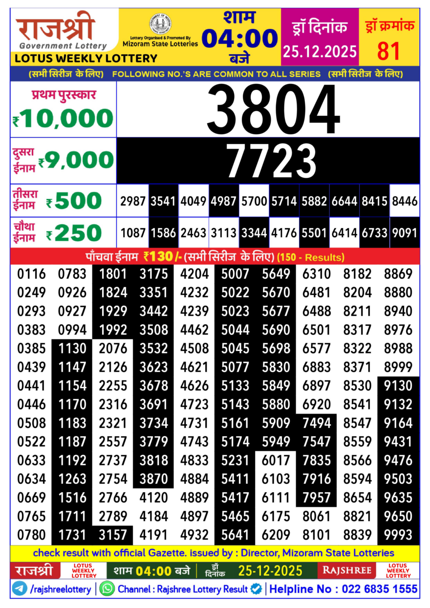 Rajshree Lotus Weekly Lottery 4pm Result 25.12.2025