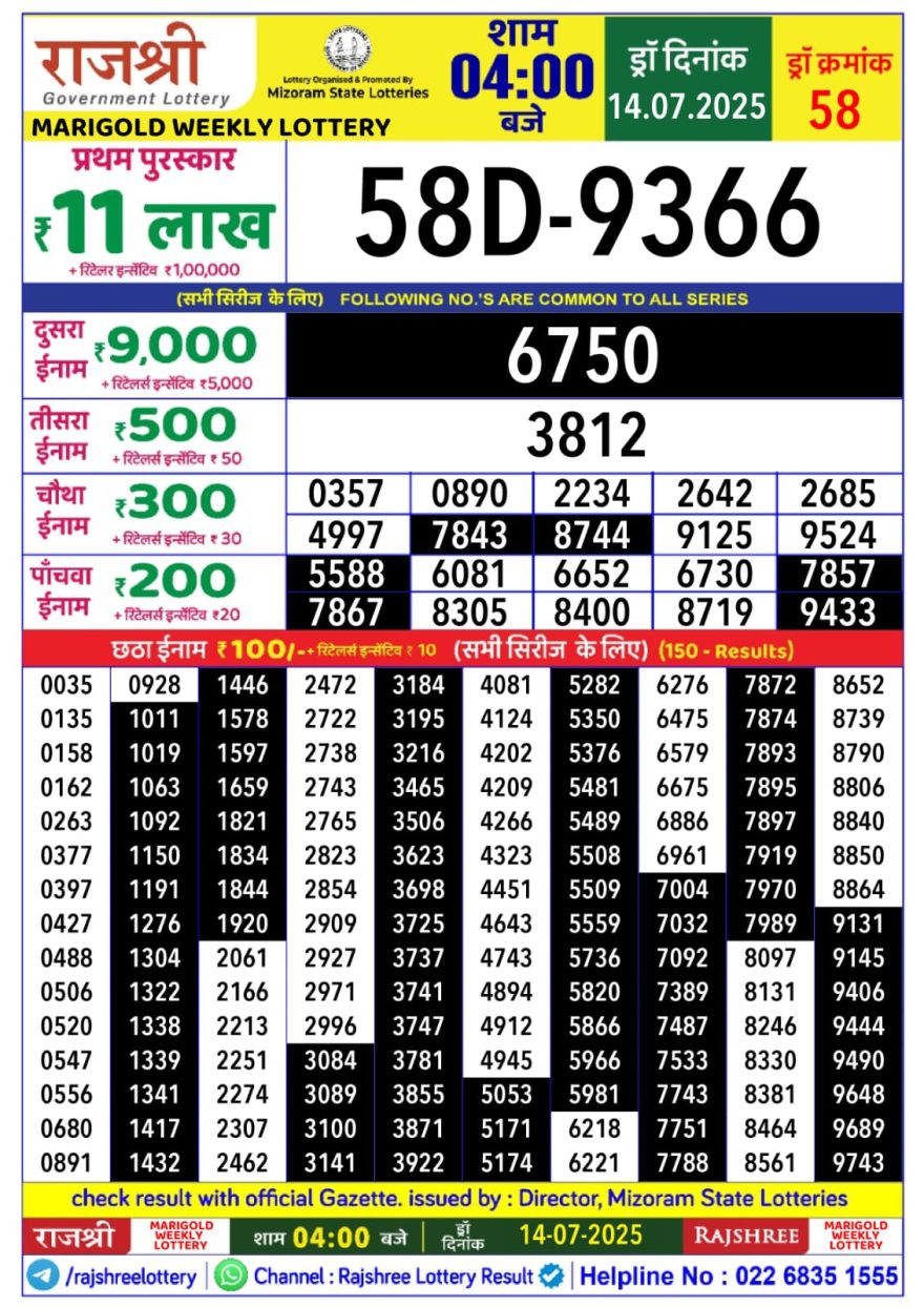 Rajshree marigold monday Weekly Lottery 4PM Result 14.07.2025