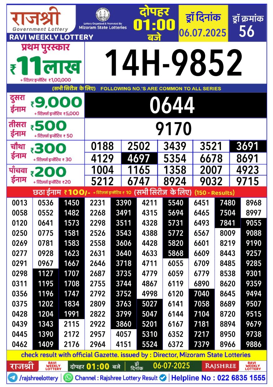 Rajshree ravi  Weekly Lottery 1PM Result 06.07.2025