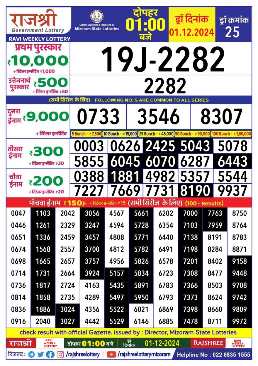 Rajshree ravi  Weekly Lottery 1PM Result 1.12.24