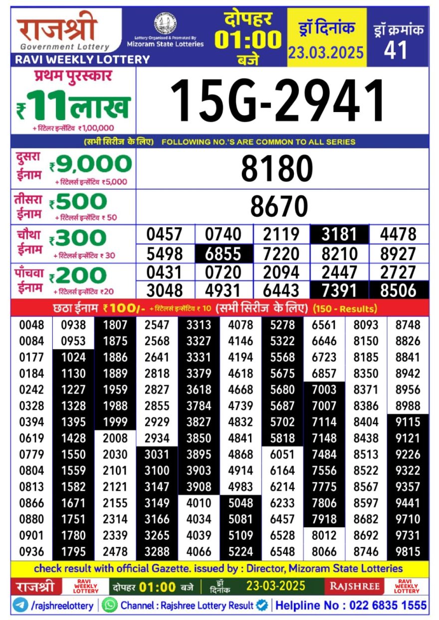 Rajshree ravi  Weekly Lottery 1PM Result 23.3.25