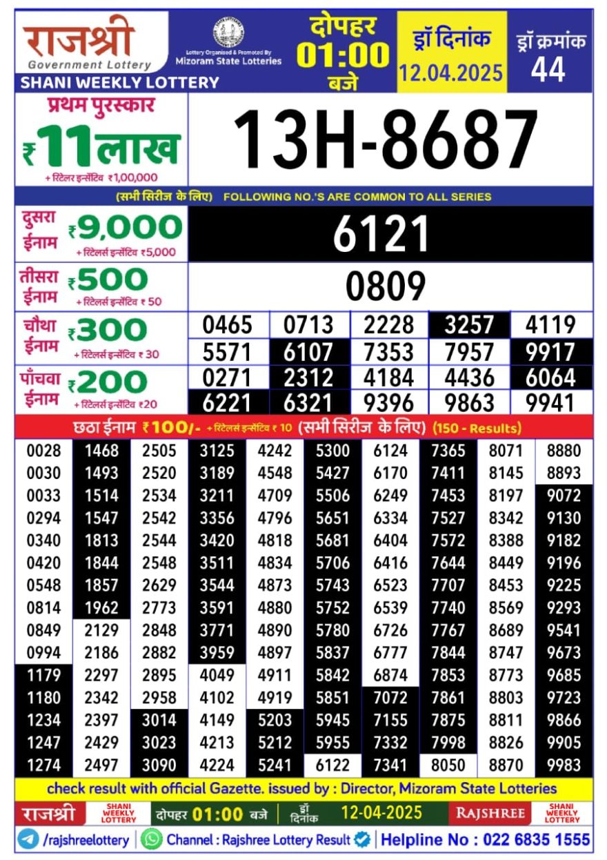 Rajshree shani Weekly Lottery 1PM Result 12.4.25