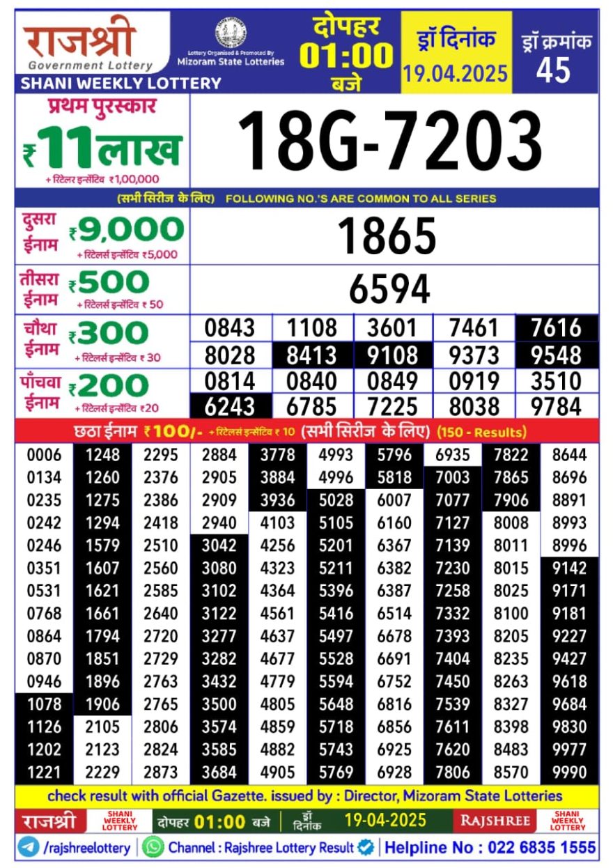 Rajshree shani Weekly Lottery 1PM Result 19.4.25