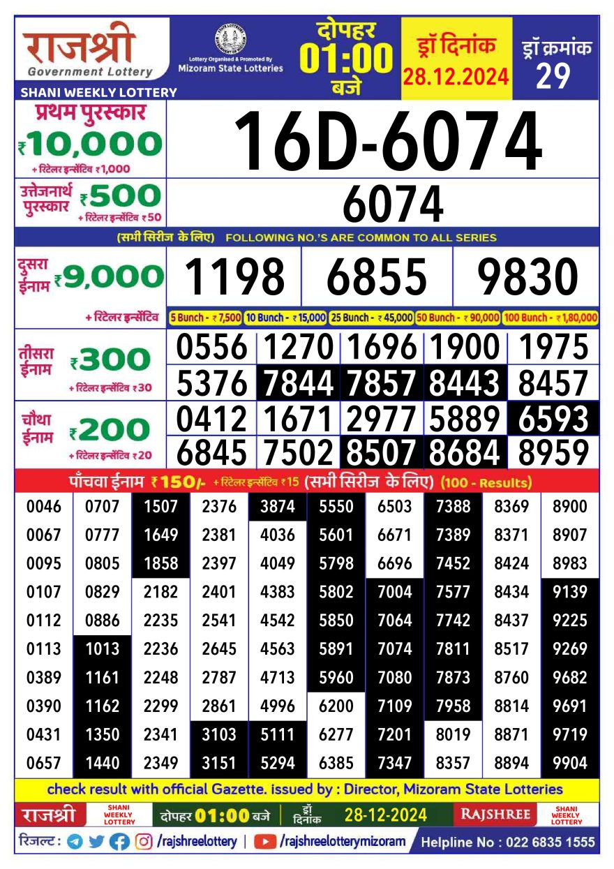 Rajshree shani Weekly Lottery 1PM Result 28.12.24
