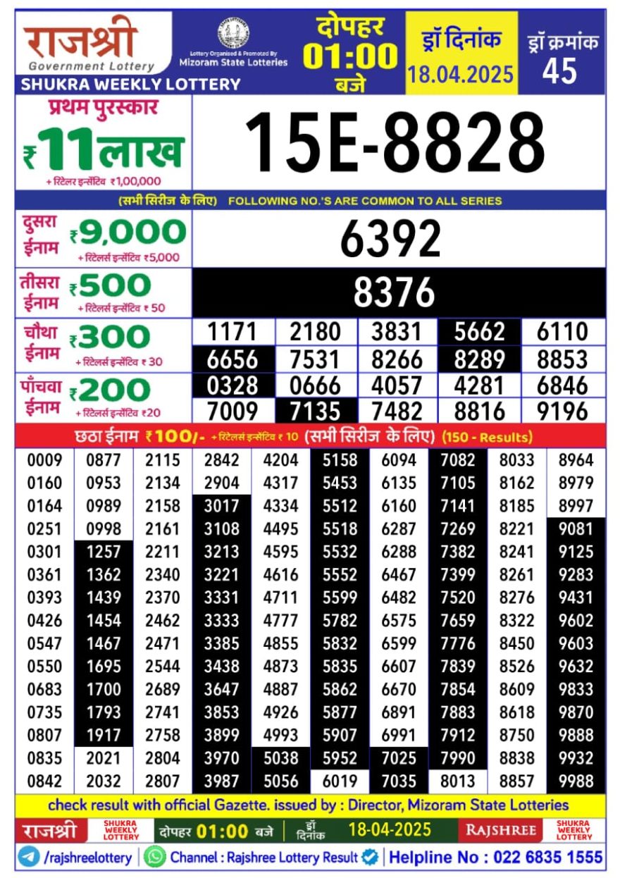 Rajshree shukra Weekly Lottery 1PM Result 18.4.25