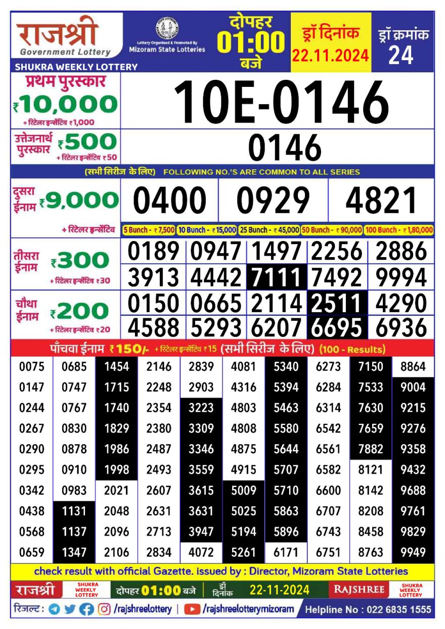 Rajshree shukra Weekly Lottery 1PM Result 22.11.24