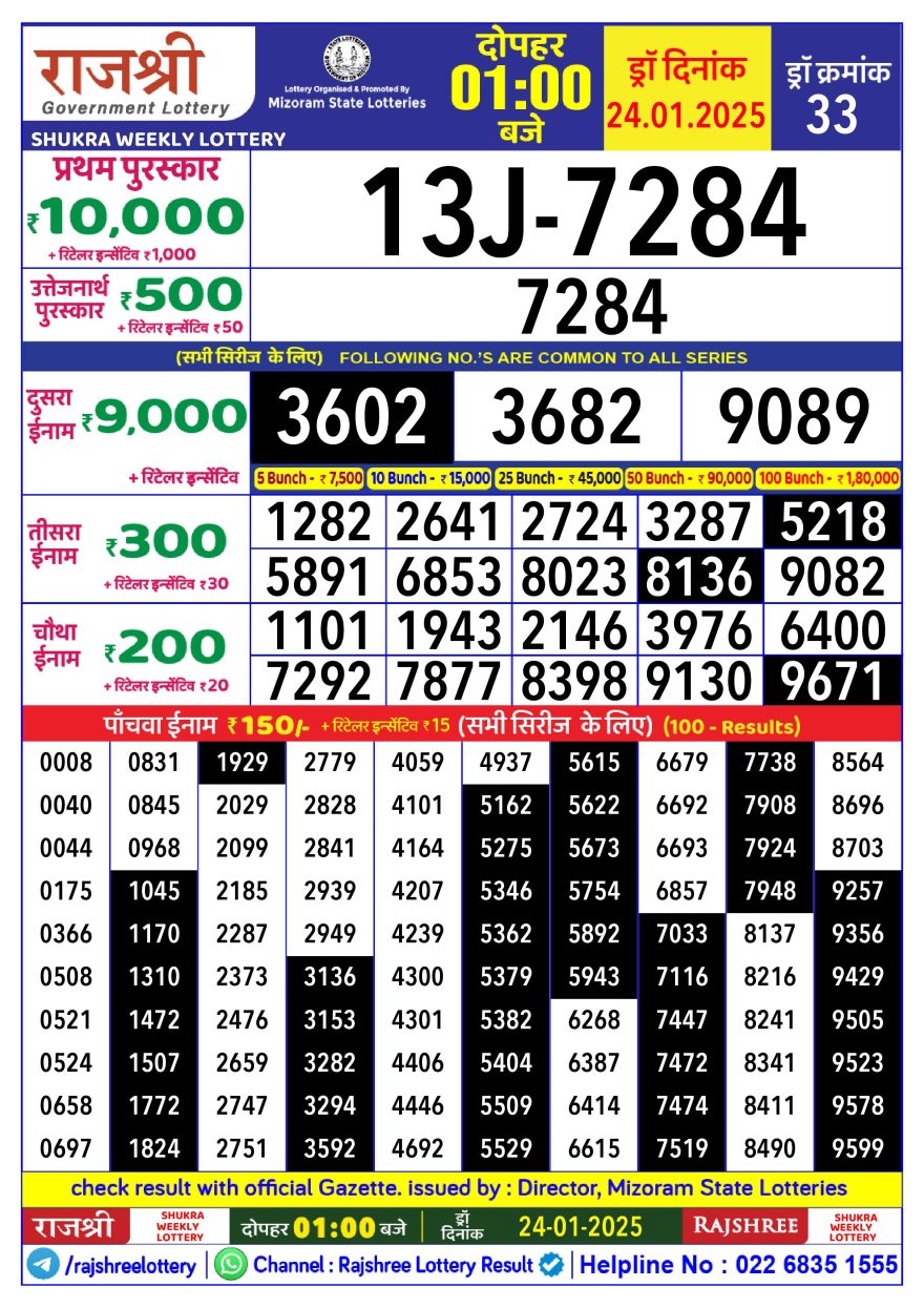 Rajshree shukra Weekly Lottery 1PM Result 24.1.25
