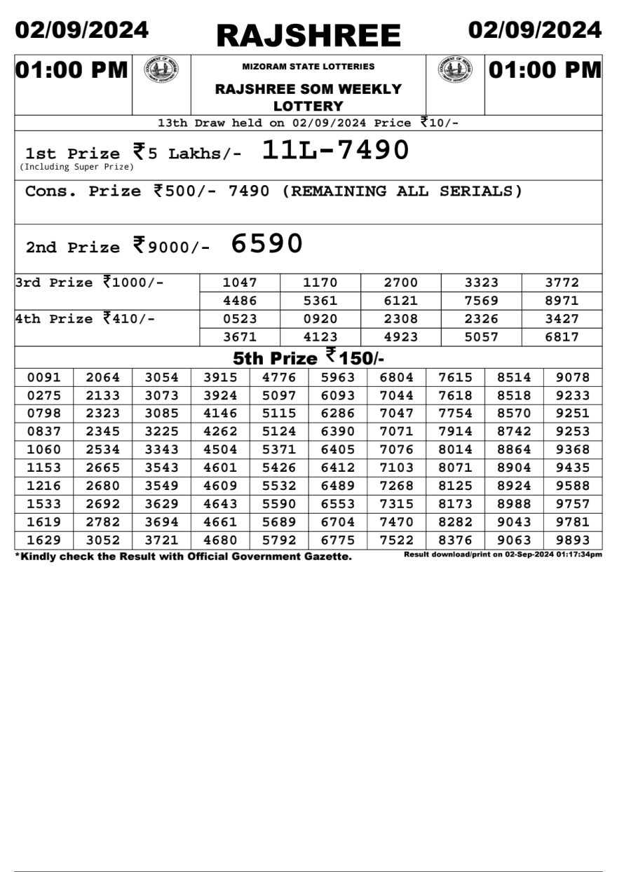 Rajshree som monday Weekly Lottery 1PM Result 2.9.24