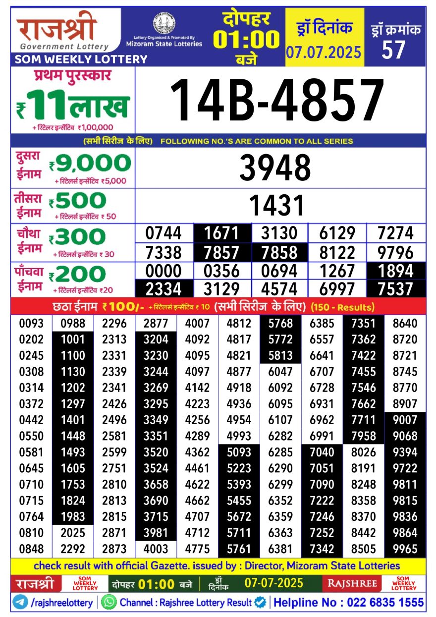 Rajshree som Weekly Lottery 1PM Result 07.07.2025