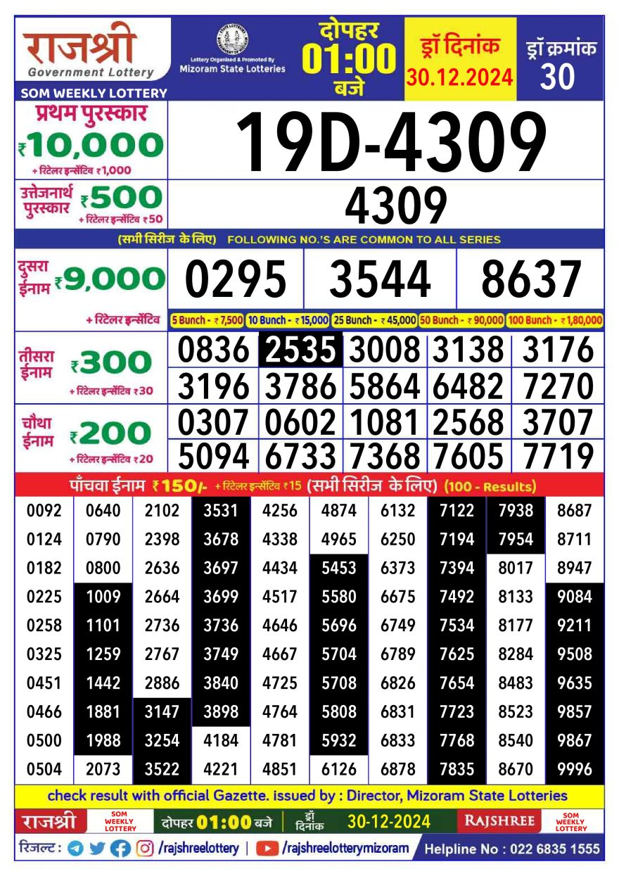 Rajshree som  Weekly Lottery 1PM Result 30.12.24