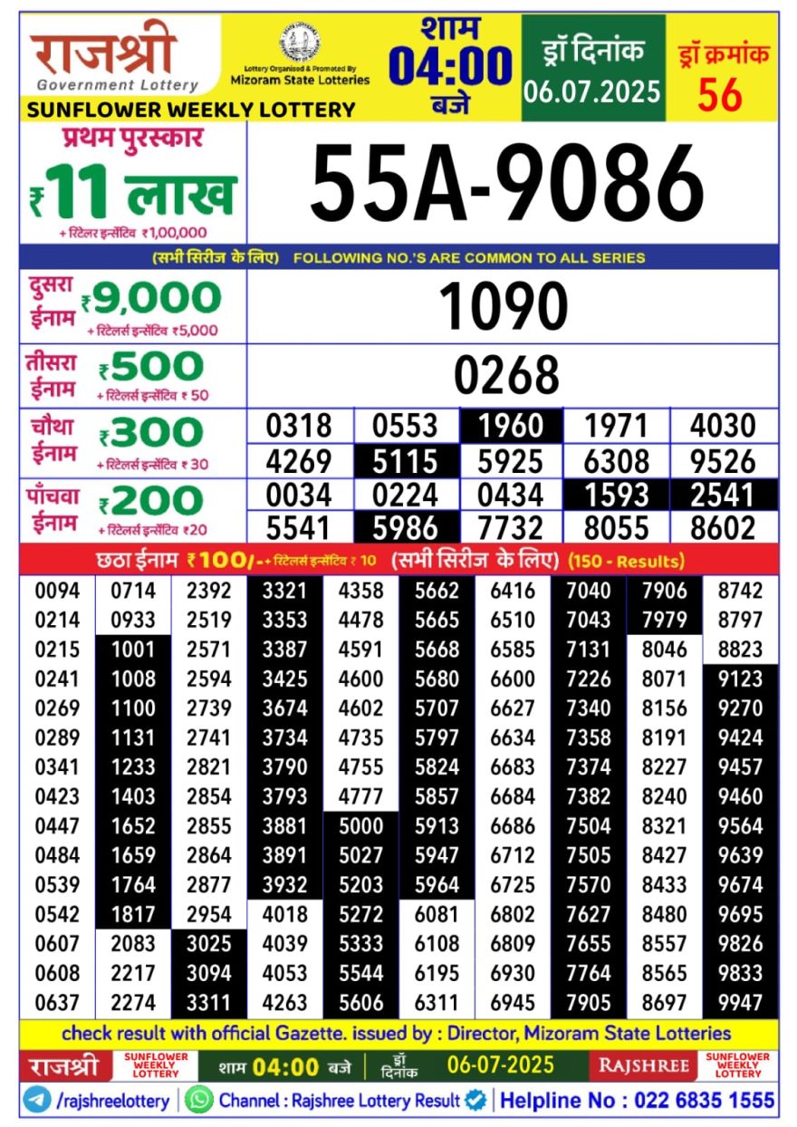 Rajshree sunflower sunday Weekly Lottery 4PM Result 06.07.2025