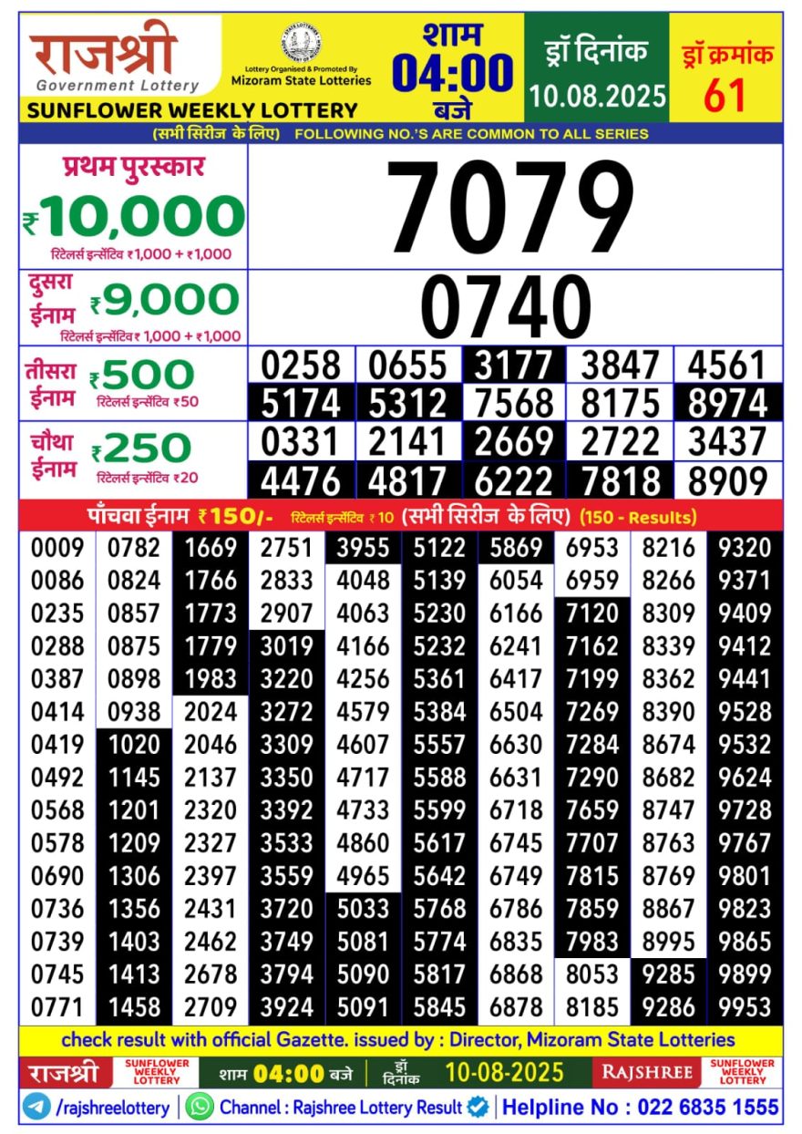 Rajshree Sunflower Sunday Weekly Lottery 4pm Result 10.08.2025