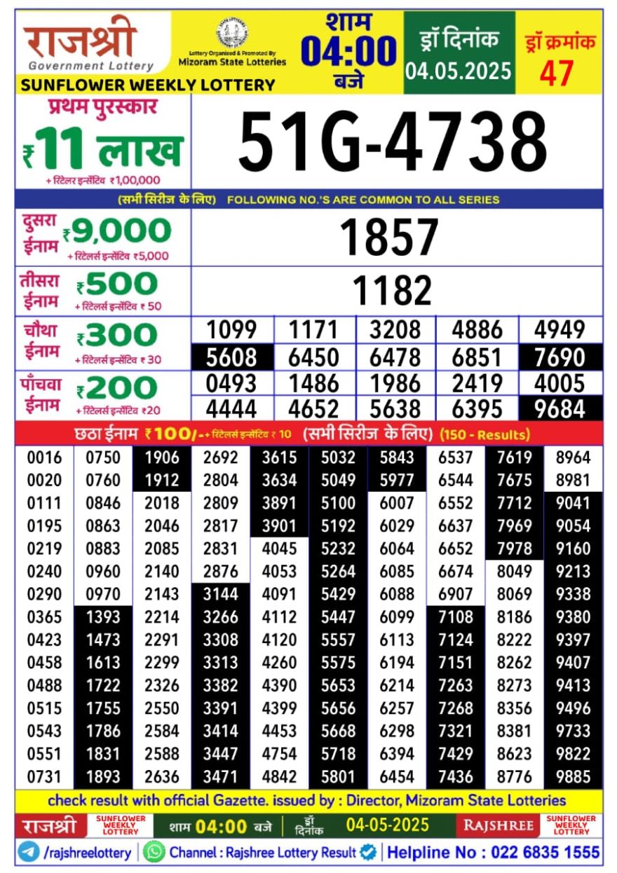 Rajshree sunflower sunday Weekly Lottery 4PM Result 4.5.25