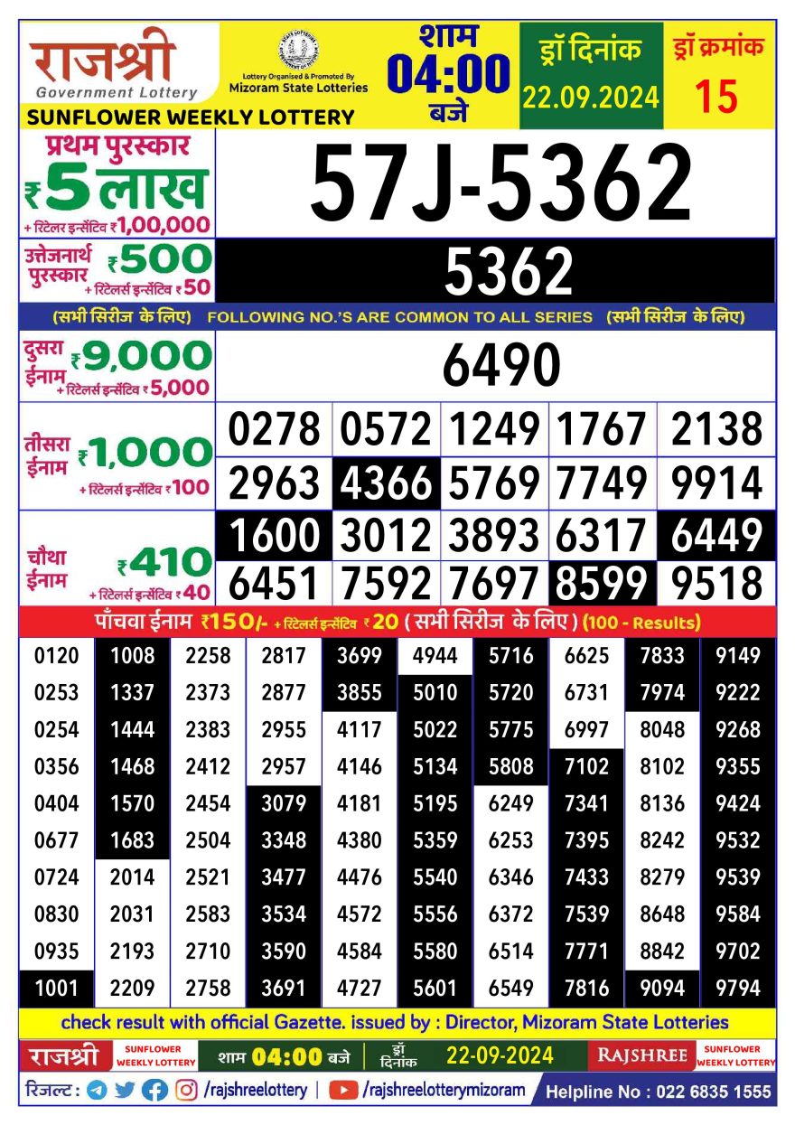 Rajshree sunflower  Weekly Lottery 4PM Result 22.09.24