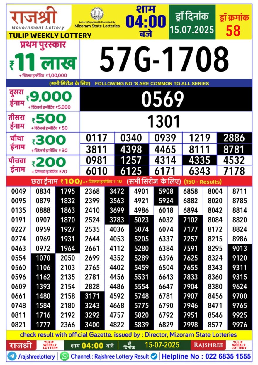 Rajshree tulip Tuesday Weekly Lottery 4PM Result 15.07.2025