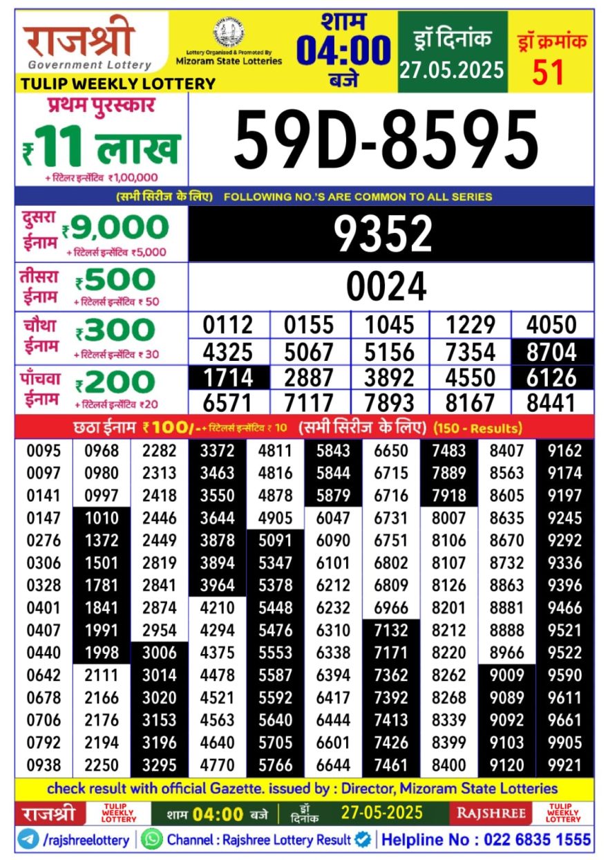 Rajshree tulip Tuesday Weekly Lottery 4PM Result 27.05.25