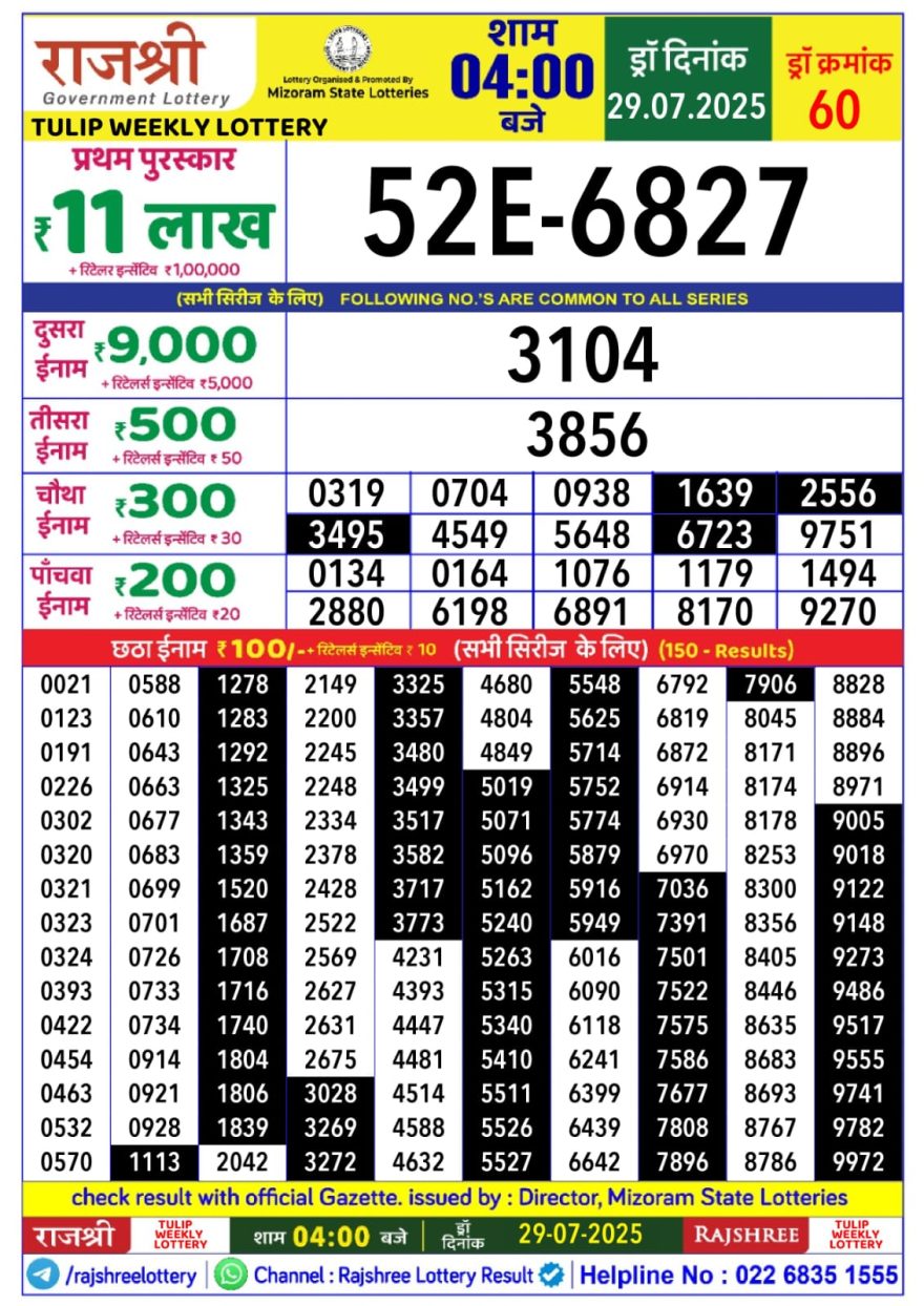 Rajshree tulip Tuesday Weekly Lottery 4PM Result 29.07.2025