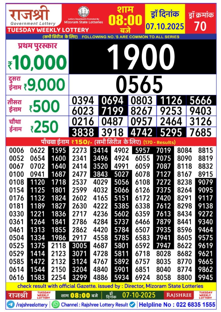 Rajshree Weekly Lottery 8pm Result 07.10.2025