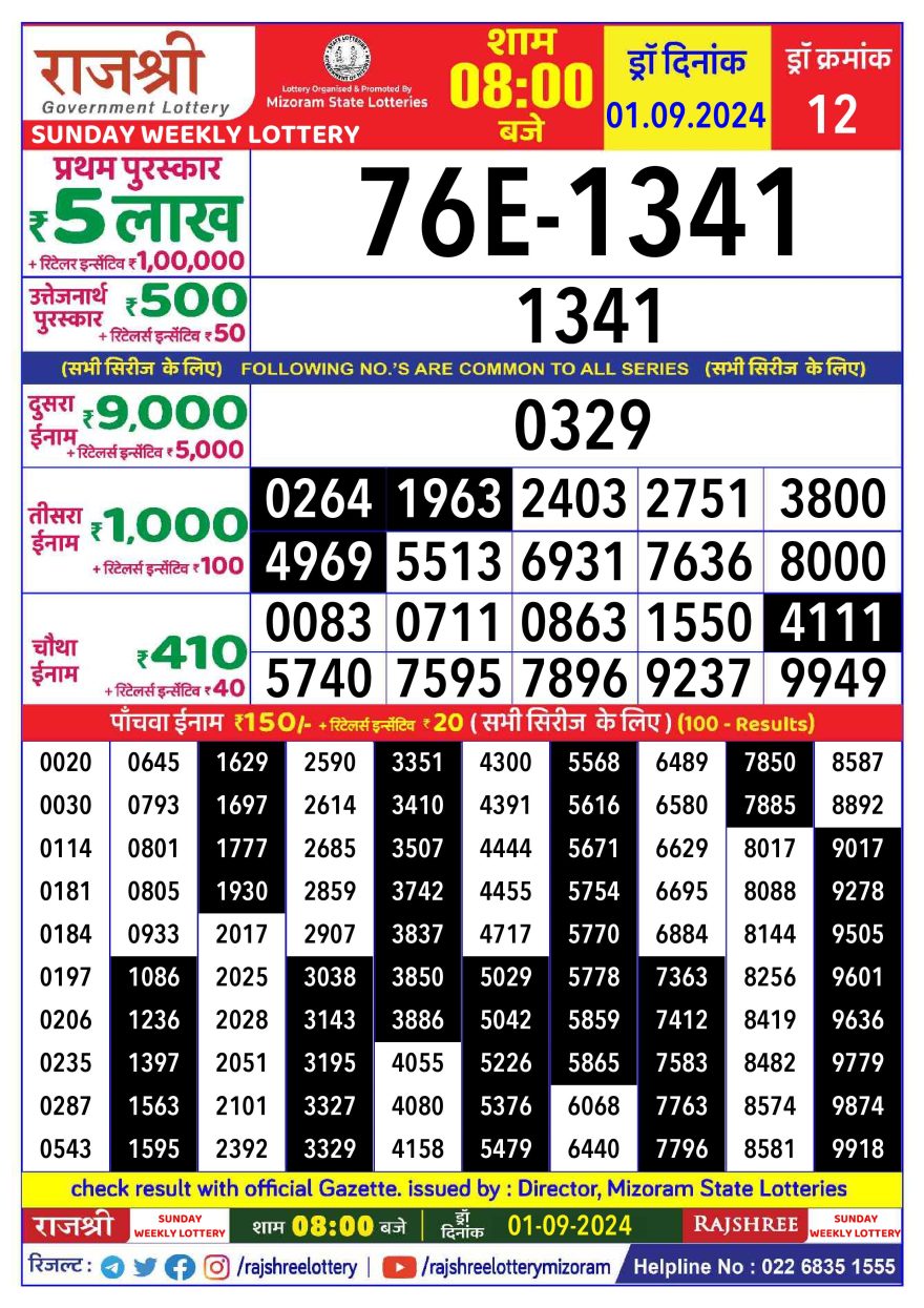 Rajshree  Weekly Lottery 8PM Result 1.09.24