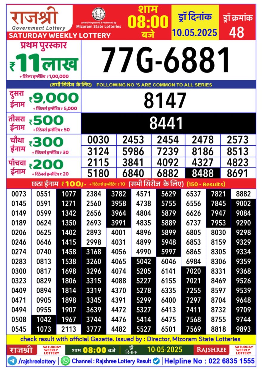 Rajshree Weekly Lottery 8PM Result 10.5.25