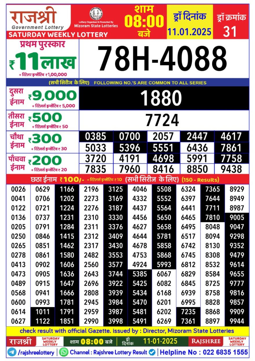 Rajshree Weekly Lottery 8PM Result 11.1.25