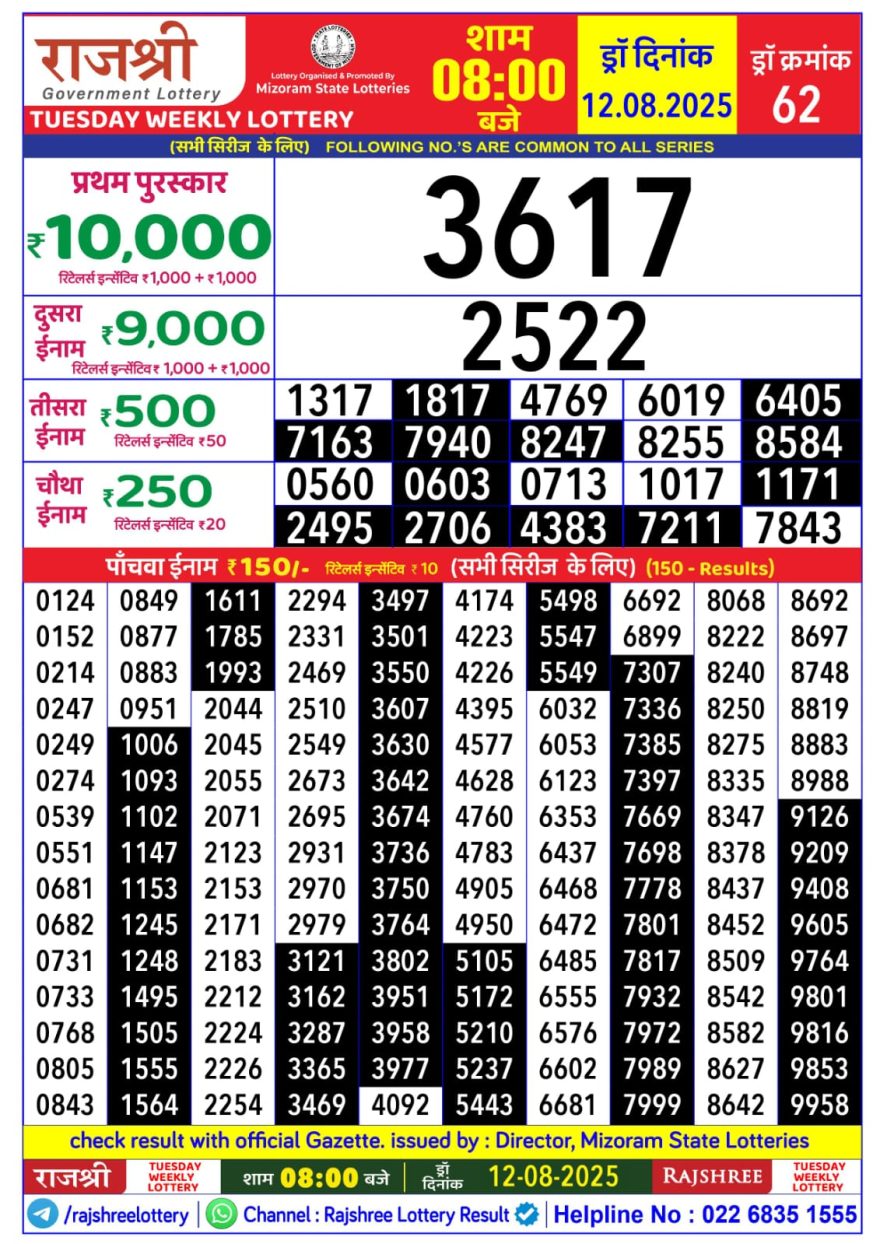 Rajshree Weekly Lottery 8pm Result 12.08.2025